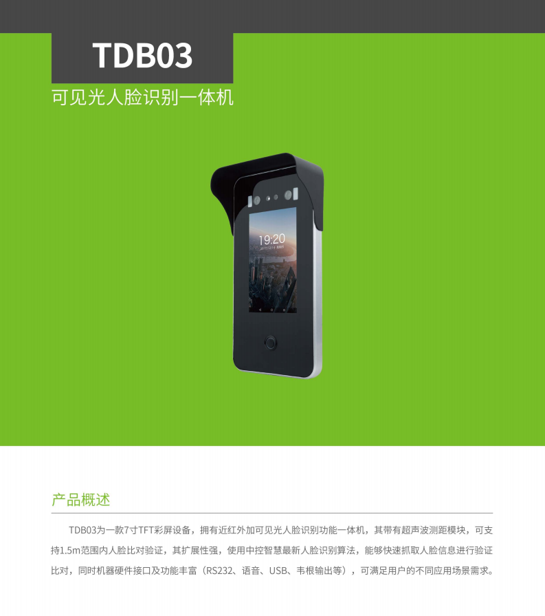 TDB03為一款7寸TFT彩屏設(shè)備,擁有近紅外加可見(jiàn)光人臉識(shí)別功能一體機(jī),其帶有超聲波測(cè)距模塊,可支持1.5m范圍內(nèi)人臉比對(duì)驗(yàn)證,其擴(kuò)展性強(qiáng),使用中控智慧最新人臉識(shí)別算法,能夠快速抓取人臉信息進(jìn)行驗(yàn)證比對(duì),同時(shí)機(jī)器硬件接口及功能豐富(RS232、語(yǔ)音、USB、韋根輸出等),可滿(mǎn)足用戶(hù)的不同應(yīng)用場(chǎng)景需求。