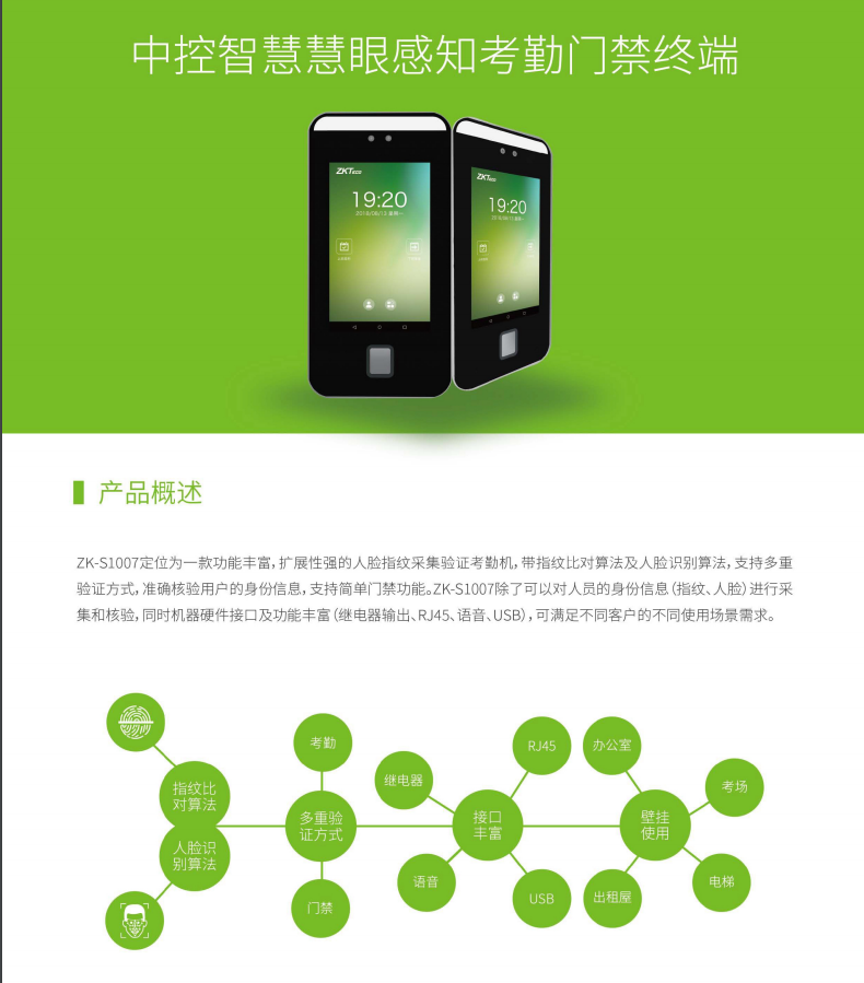 慧眼感知系列考勤門禁終端定位為功能豐富、擴(kuò)展性強(qiáng)的面部指紋采集驗(yàn)證產(chǎn)品,達(dá)到更好地產(chǎn)品體驗(yàn)。ZK-S1007擁有中控智慧全新的指紋比對算法及人臉識(shí)別算法,支持多重驗(yàn)證方式,準(zhǔn)確核驗(yàn)用戶的身份信息,支持簡單門禁功能,對人員的身份信息(指紋、人臉)進(jìn)行采集和核驗(yàn),產(chǎn)品具有機(jī)器硬件接口,配備多種功能(繼電器輸出、RJ45、語音、USB、韋根輸出),可滿足不同客戶的不同使用場景需求。