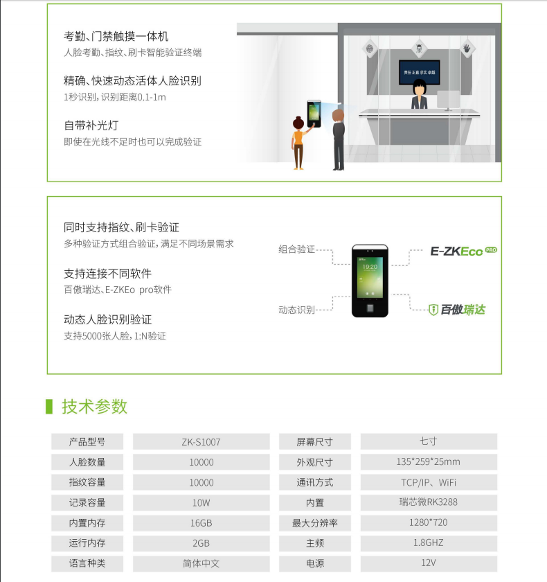 產(chǎn)品名稱 | ZK-S1007慧眼感知考勤門禁終端 | ||