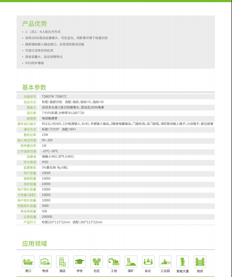 TDB07M/TDM07Z為一款7寸IPS彩屏設備,擁有多光譜人臉識別功能一體機,其擴展性強,使用中控智慧最新人臉識別算法,能夠快速抓取人臉信息驗證比對,機器硬件接口及功能豐富(RS232、RS485、語音、USB、韋根輸入輸出、輔助輸入輸出等),此產品既可應用于通道,也可作為門禁,滿足用戶不同應用場景需求。