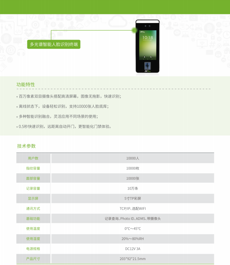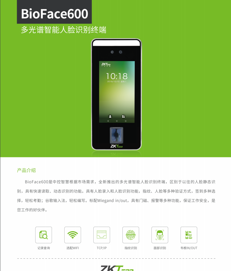 • 產品描述:BioFace系列是BioFace600動態人臉識別門禁根據市場需求,全新推出的多光譜智能人臉識別終端,區別于以往的人臉靜態識別,具有快速讀取、動態識別的功能。BioFace具有人臉錄入和人臉識別功能,指紋、人臉等多種驗證方式,簽到多種選擇,輕松考勤;谷歌輸入法,輕松編寫。標配Wiegand in/out,具有門磁、報警等多種功能,守護您工作安全。